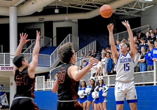 Photo by JOEL TAKARSH/for The Daily Courier PIC #0212 (L to R) RB #24, RB #20, GP #15 Cavemen win it in OT - 60-57 !!