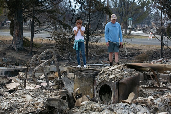 Sept. 18: Scott Chancey (right), the director of Josephine County’s transit system, and his wife Kelli survey the remains of their Willow Springs Drive home after the Almeda Fire tore through their subdivision in Talent. Kelli ran a half-mile in bare feet as the fire closed in to rescue their two cats, Moby and Dolly.