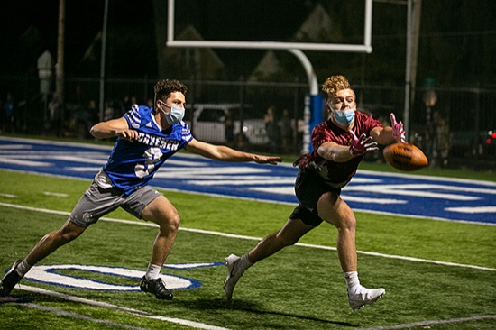 Oct. 15: The COVID-19 pandemic upended high school sports. Football was transformed into 7-on-7 contests with no tackling and no scorekeeping. Here, Grants Pass’ Cole Nicholas (left) defends as North Valley’s Chase Comyford watches a pass sail past his fingertips at Mel Ingram Field.