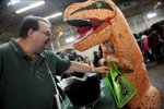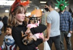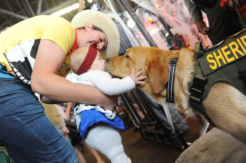 Elliana Leisy, held by dad Ben Leisy, both of Grants Pass, gets a kiss from Sheriff's dog Gibbs during a trunk or treat event at the Josephine County fairgrounds in Grants Pass Sat. Oct. 30, 2021.