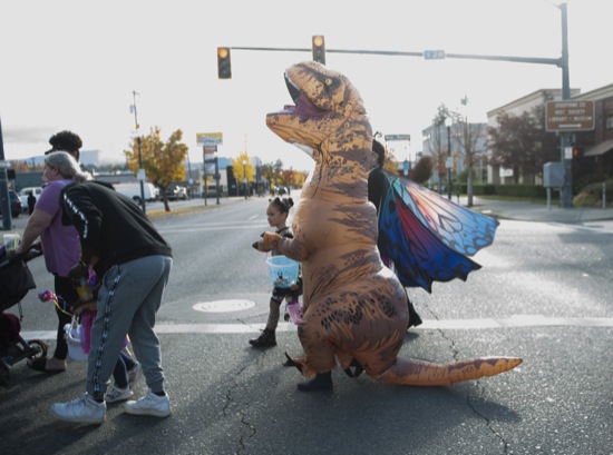 BEA AHBECK/Daily Courier A dinosaur crosses the street during the downtown trick or treat in Grants Pass Sat. Oct. 30, 2021.
