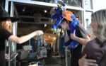 Evan Hint, 6, of Grants Pass, right, gets candy from Traia Wilde as Diane Lweis, left, looks on, outside Wild Rogue Emporium during the downtown trick or treat in Grants Pass Sat. Oct. 30, 2021.