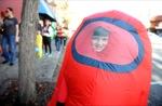 Dad Cody McEwen holds Elijah McEwen, 11 months, dressed as a spider, as he gets candy during the downtown trick or treat in Grants Pass Sat. Oct. 30, 2021.