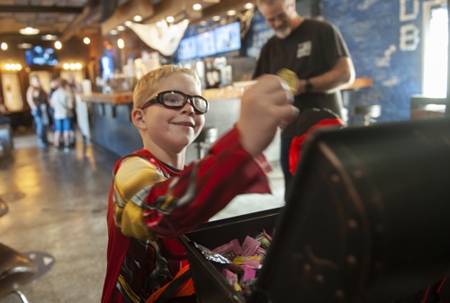 Joshua Nescher, 8, of Grants Pass, picks a candy coin out of the treasure chest at Dutch Bros. during the downtown trick or treat in Grants Pass Sat. Oct. 30, 2021.