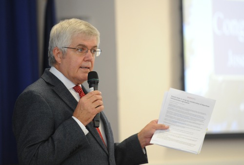 BEA AHBECK/Daily Courier Representative Cliff Bentz (R-Ontario) speaks about the infrastructure bill during a town hall meeting in Grants Pass Wed. Nov. 10, 2021.