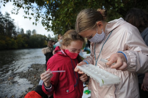Allen Dale Elementary students Riley Allen, 11, and Katie Klein, 10, look for bugs during a field trip to the river at Reinhart Volunteer Park in Grants Pass Fri. Oct. 22, 2021.