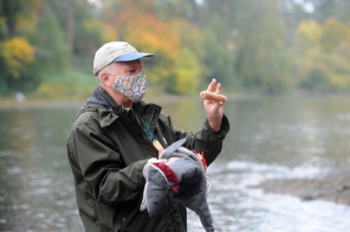 Jon Raybourn, fish biologist with the Bureau of Land Management, talks about the spawning rituals of the Chinook salmon as he holds a model of the egg sack during an Allen Dale Elementary field trip to the river at Reinhart Volunteer Park in Grants Pass Fri. Oct. 22, 2021.