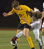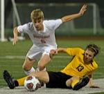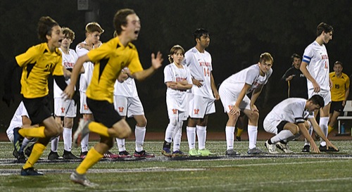 SCOTT STODDARD/Daily Courier Hidden Valley's players react as Philomath players celebrate winning the penalty kick shootout and the state championship.