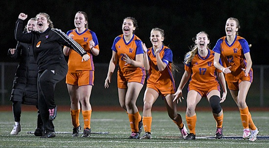 Hidden Valley's (from left) Emma Trader, Olivia McCurdy, Lily Emmons, Gracelyn DaVault, Leah Beachy, Taya Mendoza and Gabby Heverly celebrate after freshman teammate Hannah Rommes converted her penalty kick during the shootout.