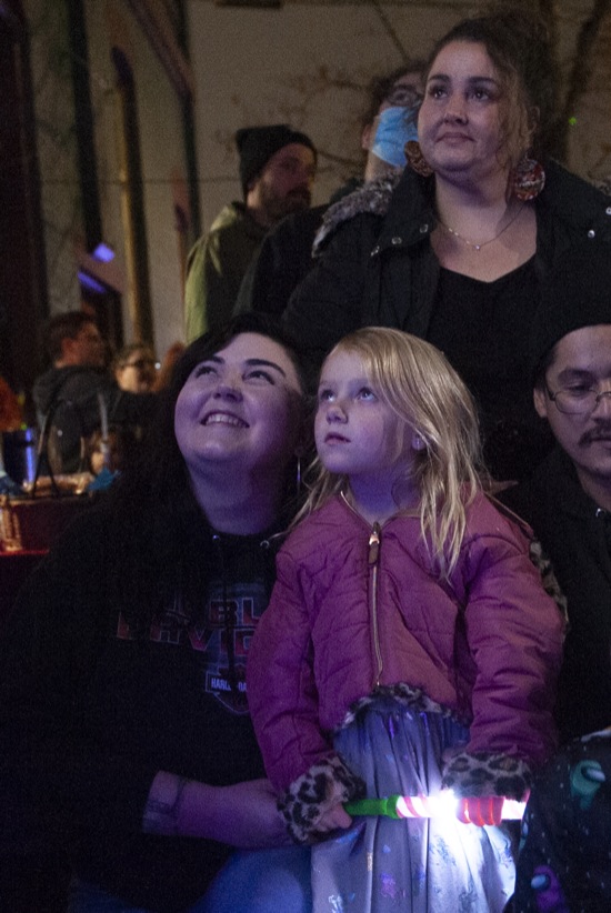BEA AHBECK/Daily Courier Step-mom Jenson Dion with Zinnia Stenger, 6, watch Santa via zoom during the Christmas tree lighting event in Grants Pass Fri. Dec. 3, 2021.
