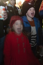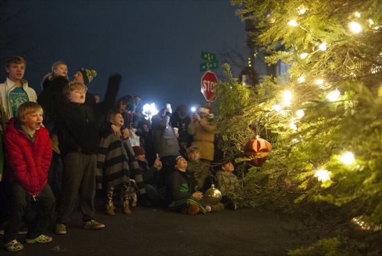 (front row): Martiel Favro, 8, (in red) and Warren Favor, 10, react to the Christmas tree being lit during the Christmas tree lighting event in Grants Pass Fri. Dec. 3, 2021.