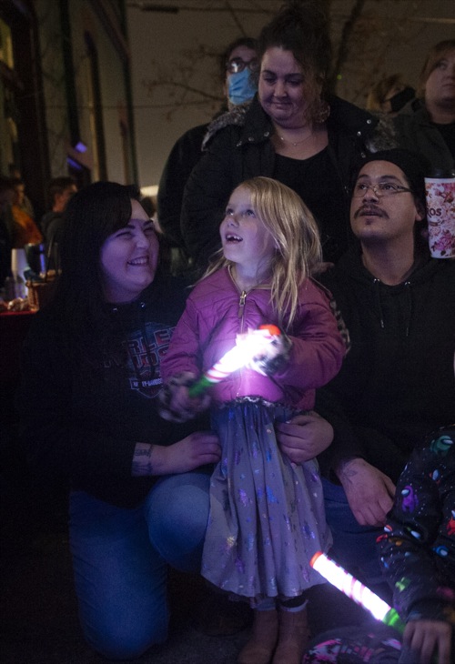 BEA AHBECK/Daily Courier Step-mom Jenson Dion with Zinnia Stenger, 6, watch Santa via zoom during the Christmas tree lighting event in Grants Pass Fri. Dec. 3, 2021.