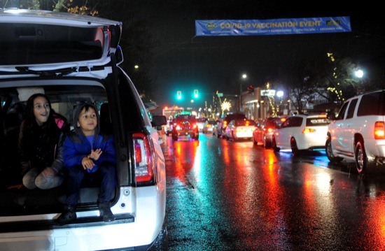 Siblings Lillie (10) and Edward (8) Montelongo, of Grants Pass, watch the parade from the back of their car during the Christmas parade in downtown Grants Pass Sat. Dec. 11, 2021.