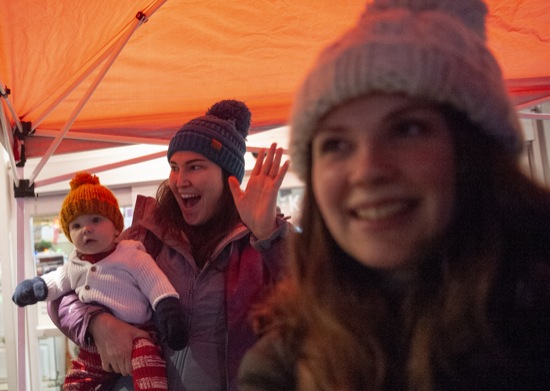Melissa Aslakson, holding daughter Kimberly, 7 months, both of Grants Pass, waves to the parade during the Christmas parade in downtown Grants Pass Sat. Dec. 11, 2021.