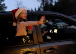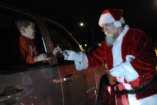 BEA AHBECK/Daily Courier Declan York, 5, gets a candy cane from Santa during the 2nd annual GP Express at Parkside Elementary in Grants Pass Thurs. Dec. 16, 2021.