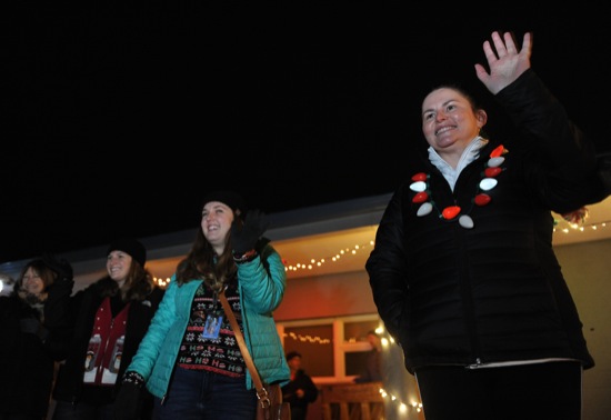 Highland Elementary third grade teachers Katie Gleffe and Kaylee Allen and 5th grade teacher Mandy Jackson wave to students during the 2nd annual GP Express at Highland Elementary in Grants Pass Thurs. Dec. 16, 2021.