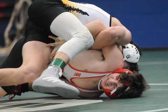 BEA AHBECK/Daily Courier Illinois Valley's Talen Schaffer wrestles Philomath's Chase Ringwald during their 126-pound match Fri. Dec. 17, 2021. Ringwald won.