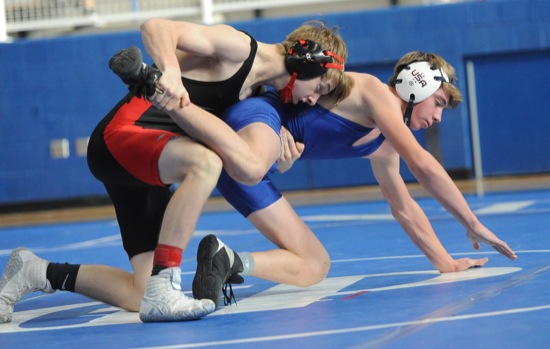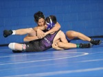 BEA AHBECK/Daily Courier Grants Pass' Mark Astry (right) wrestles Etna Union's Colton Downey during their 126-pound match Fri. Dec. 17, 2021. Downey won.
