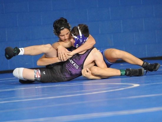 BEA AHBECK/Daily Courier Grants Pass' Christian Dara wrestles Murdock's Jafeth Mendez during their 132-pound match Fri. Dec. 17, 2021. Dara won.