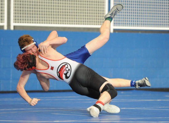 BEA AHBECK/Daily Courier Grants Pass' Cole Carnes wrestles Illinois Valley's Ryon Martinho during their 152-pound match Fri. Dec. 17, 2021. Martinho won.