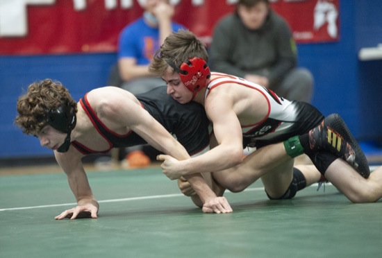 lllinois Valley's Michael Miller wrestles Lowell's Harley Harrison during the championship final 106-pound match in Grants Pass Fri. Dec. 18, 2021. Miller won.