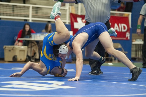 BEA AHBECK/Daily Courier Grants Pass'Ryan Johnston wrestles Siuslaw's Mason Buss during the championship final 170-pound match in Grants Pass Fri. Dec. 18, 2021. Johnston won.