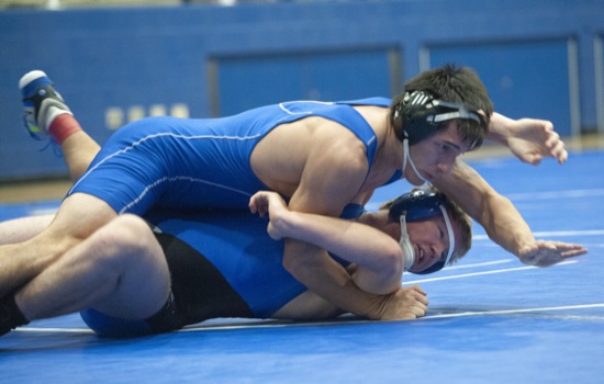 BEA AHBECK/Daily Courier Grants Pass' Dredan Myers wrestles Fortuna's Weyland Mcknight during the championship final 182-pound match in Grants Pass Fri. Dec. 18, 2021. Myers won.