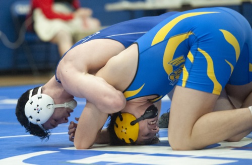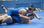 Grants Pass' Ryan Johnston wrestles Siuslaw's Mason Buss during the championship final 170-pound match in Grants Pass Fri. Dec. 18, 2021. Johnston won.