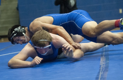 BEA AHBECK/Daily Courier Grants Pass' Dredan Myers wrestles Fortuna's Weyland Mcknight during the championship final 182-pound match in Grants Pass Fri. Dec. 18, 2021. Myers won.