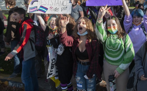 Students wave goodbye to an anti-abortion and counter-protester after they escorted her down the street and away from the school as students and community members walk out of Grants Pass high school to protest the school board's reinstatement of North Middle School assistant principal Rachel Damiano and science teacher Katie Medart, at Grants Pass High School in Grants Pass Tues. Nov. 16, 2021.