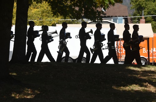 Members of the Grants Pass High marching band walk to rehearse during the Pride of the Northwest Marching Band Competition in Grants Pass, Sat. Oct. 9, 2021. Grants Pass High school was hosting and performed an exhibition performance.