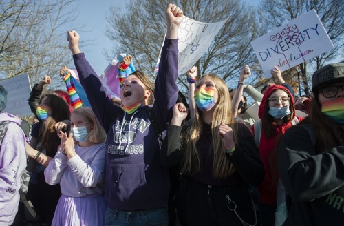 Students protest as they walk out of Grants Pass high school to protest the school board's reinstatement of North Middle School assistant principal Rachel Damiano and science teacher Katie Medart, at Grants Pass High School in Grants Pass Tues. Nov. 16, 2021.