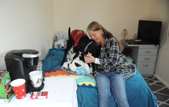 BEA AHBECK/Daily Courier Resident Donna Moseley snuggles her dog Luna in her dwelling at Foundry Village in Grants Pass Fri. Dec. 10, 2021.