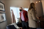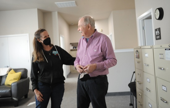 Project Youth+ program manager Kim DeSimone chats with Tom Drummond during the Project Youth+ opening celebration of The Drummond Family Center for Youth Excellence in Grants Pass Wed. Jan 26, 2022.