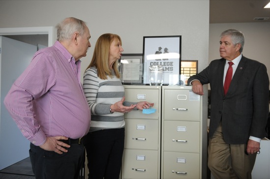 Tom and Judie Drummond speak with congressman Cliff Bentz, R-Ontario, during the Project Youth+ opening celebration of The Drummond Family Center for Youth Excellence in Grants Pass Wed. Jan 26, 2022.