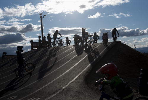 Bea Ahbeck/Daily Courier Riders at the start are silhouetted at the new River City BMX bicycle racing track in Grants Pass Sat. March 5, 2022.