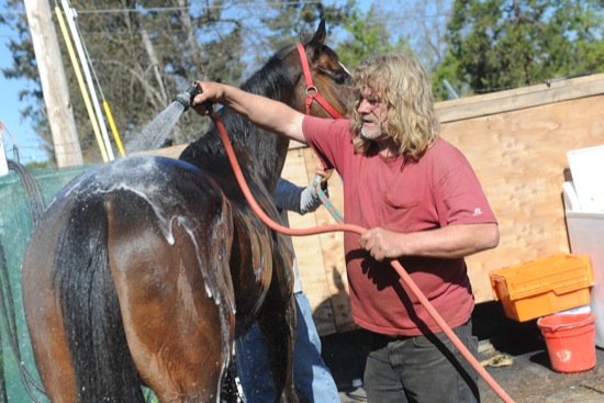 Bea Ahbeck/Daily Courier Groom Jerry Greiner washes a horse at Grants Pass Downs in Grants Pass Thurs. April 7, 2022.