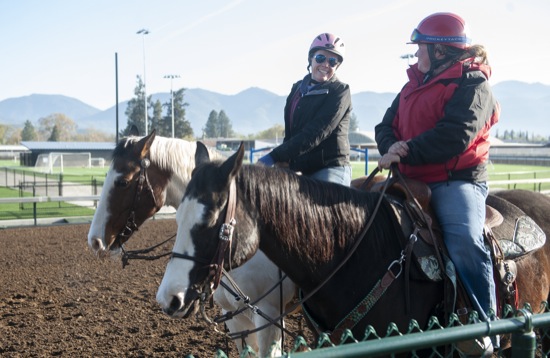 Bea Ahbeck/Daily Courier Naomi Driscoll and outrider Shania Ehret chat while out on the track at Grants Pass Downs in Grants Pass Thurs. April 7, 2022.