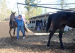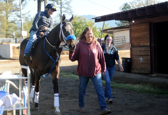 Bea Ahbeck/Daily Courier Trainer Margie Cantrell walks jockey David Martin as groom Nova Bond, right, walks alongside, at Grants Pass Downs in Grants Pass Thurs. April 7, 2022.