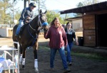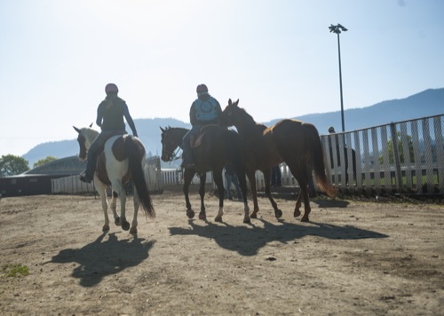 Naomi Driscoll, left, who referred to herself as "new pony person", and trainer Sandy Gale head for the track at Grants Pass Downs in Grants Pass Thurs. April 7, 2022.