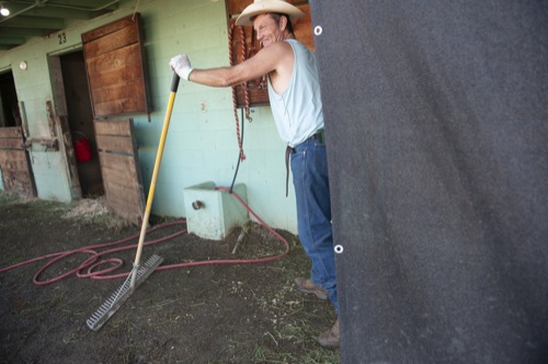 Bea Ahbeck/Daily Courier Groom Michael Donoho works in the stables at Grants Pass Downs in Grants Pass Thurs. April 7, 2022.