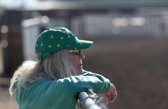 Bea Ahbeck/Daily Courier Owner and trainer Mary Boyle looks out over the tracks at Grants Pass Downs in Grants Pass Thurs. April 7, 2022.