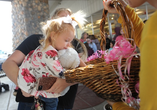 BEA AHBECK / Daily Courier Paisley Israel, 2, of Grants Pass, held by mom Tessa Israel, gets an Easter egg after visiting the Easter bunny in Grants Pass Sat. April 9, 2022.