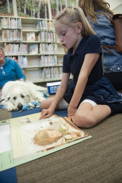 Kyla York, 7, of Grants Pass, reads to Zeke, an 8-year-old Golden retriever, during the K9 Reading Program at the Josephine County Library in Grants Pass Tues. April 5, 2022.