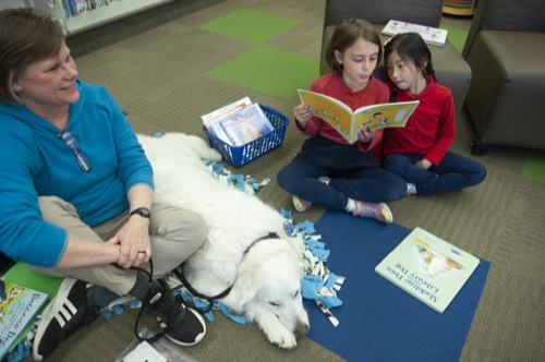 Maria Voehl, 7, and Lena Kucharik, 6, both of Grants Pass, read to Zeke, an 8-year-old Golden retriever, during the K9 Reading Program at the Josephine County Library in Grants Pass Tues. April 5, 2022. To left Zeke's human Sandy Sotelo of Grants Pass.