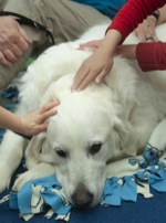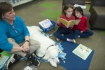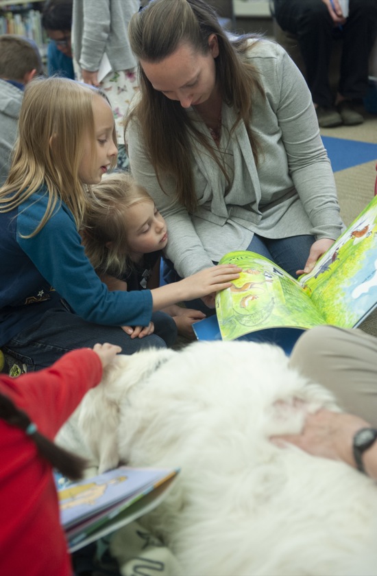 Mom Jamie Caimun, right, with Aiden, 8, and Arina, 4, middle, read to Zeke, an 8-year-old Golden retriever, during the K9 Reading Program at the Josephine County Library in Grants Pass Tues. April 5, 2022.