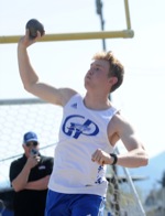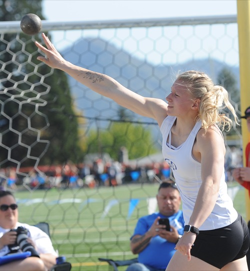Grants Pass' Grace Osborne competes in the shot put during the track and field competition at Grants Pass High in Grants Pass Wed. April 6, 2022. She was the champion of the event.