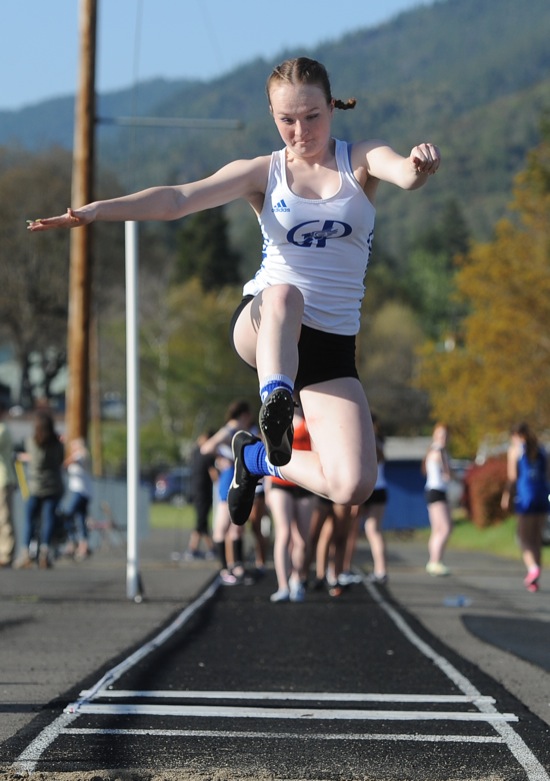 Bea Ahbeck/Daily Courier Grants Pass' Tyra Boyum competes in the long jump during the track and field competition at Grants Pass High in Grants Pass Wed. April 6, 2022.