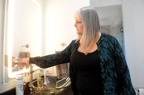 Bea Ahbeck/Daily Courier Cindy talks about the adjustable mirror lights in her and husband Harry Harboldt's rebuilt home in Grants Pass Sat. April 2, 2022.