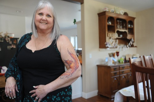 Cindy Harboldt had a Fenix tattooed on her arm after they lost their home to a fire. Pictured in her and husband Harry Harboldt's rebuilt home in Grants Pass Sat. April 2, 2022.